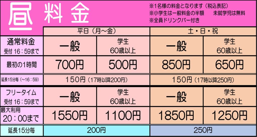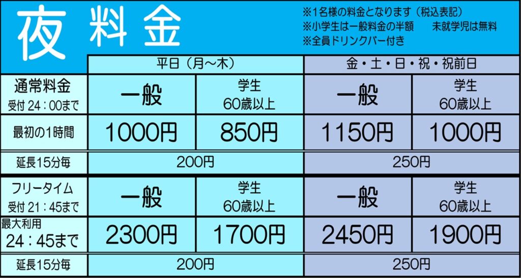 ◆16歳未満は18時まで、18歳未満または年齢を問わず高校生料金で受付の場合は22時までご利用できます。